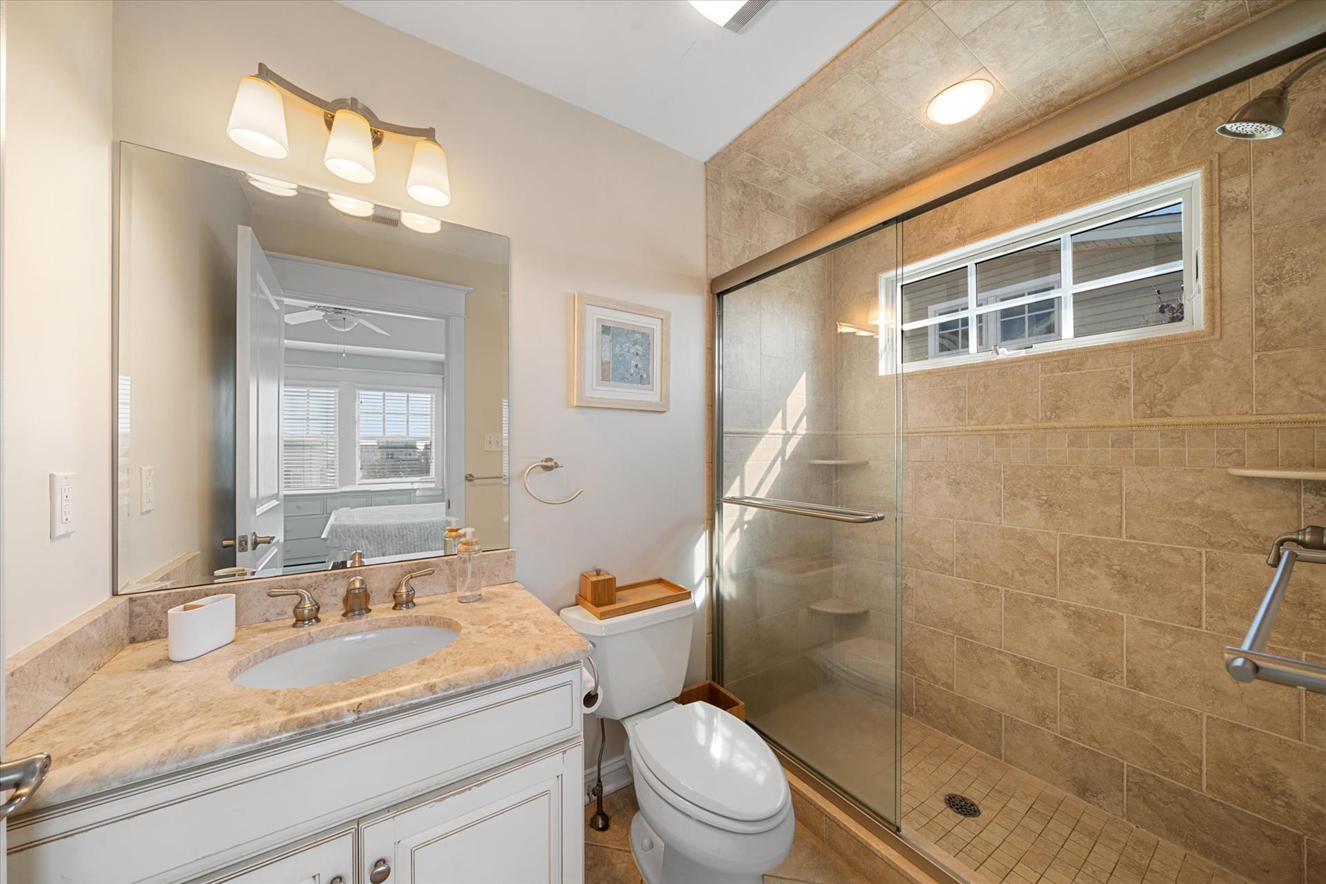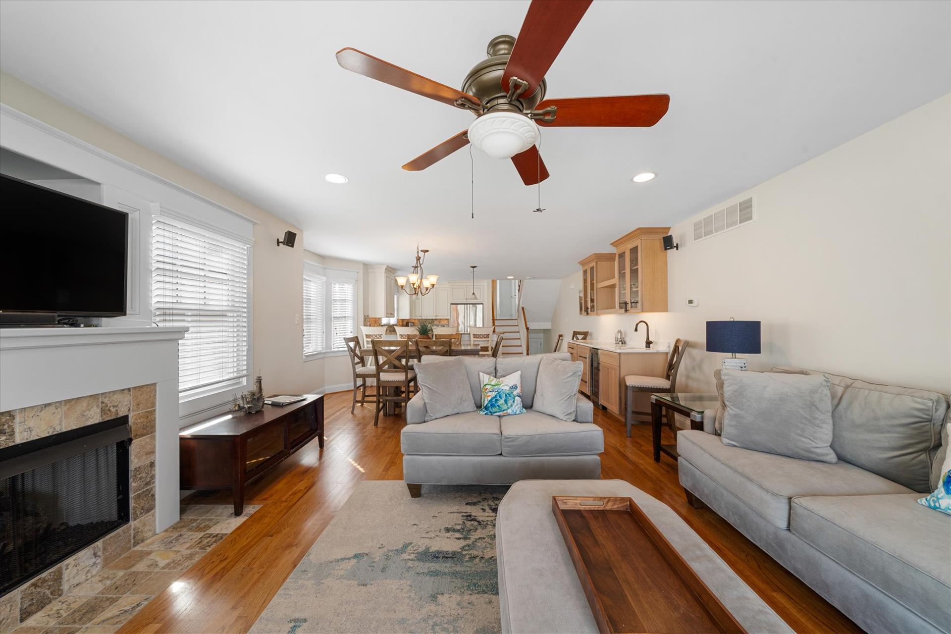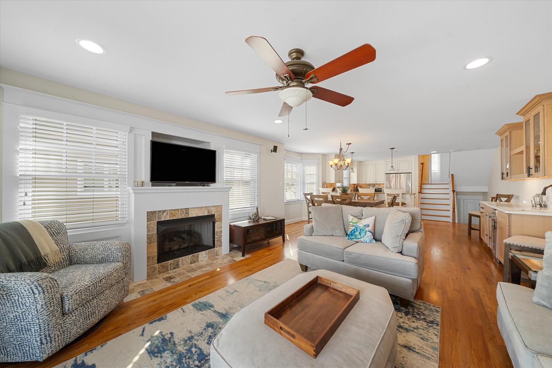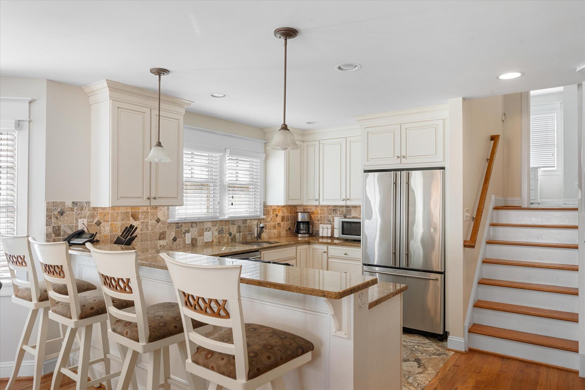 | UPSCALE TOWNHOME! This convenient location is only about 4 blocks into town & less than a block to the bay front Public Dock, where you can swim, join your boating friends, or sip a cool drink and watch the sunsets! This 3-story townhome offers multiple decks & is packed with amenities! The multiple decks enable you to follow your choice of the sun or shade! Spacious bedrooms, upgraded, custom tiled bathrooms with granite counters & glass shower enclosures, hardwood flooring throughout, a beautiful kitchen with granite counters, stainless steel appliances & more! For this multi-level townhouse, here is the floor plan: 1st level offers 1 bedroom w/2 double beds, a hall bathroom and laundry room. The 2nd level offers 1 bedroom w/2 single beds & a hall bathroom. The 3rd level offers the Great Room, the 4th level offers 1 bedroom w/Queen bed, bathroom. The 5th level offers the master suite offering a King bed & attached bathroom. The concrete crawl space adds precious storage area underneath the home while at the same time helping to limit moisture intrusion into the home. There is also a built-in storage area on the side of the building, a 2 car off street parking pad & a private outdoor shower. There is a wet bar with a wine cooler and two drawer refrigerator, and an extra refrigerator located in the 2nd floor Great room. Owner provides Wireless Internet and a changeover cleaning upon your departure! |